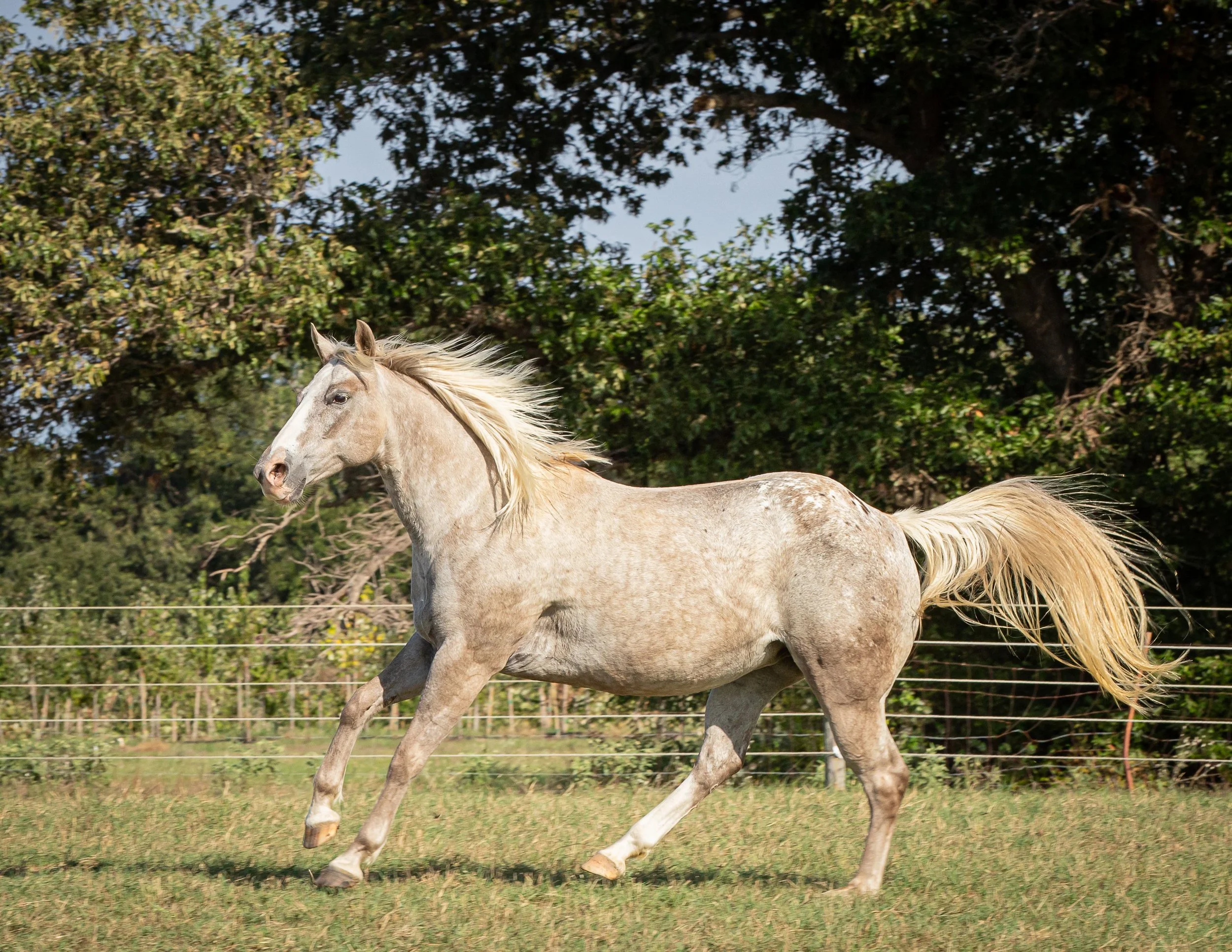 In 2022, Sky spent a few months with Patrick Sullivan of Gamilah Unbridled, who put early rides on her using his liberty method. She also spent three months in 2023 with Zoe Chappelear in Oklahoma to give her new experiences on a large cattle ranch. Sky has now returned to our ranch, where Pegasus trainer, Anthony LaSpina, is continuing to build her confidence. Sky will only be suitable for an experienced, confident rider with a quiet, gentle hand. This little Appaloosa mare is looking for guidance and leadership, and we expect that she will thrive with the right adopter.